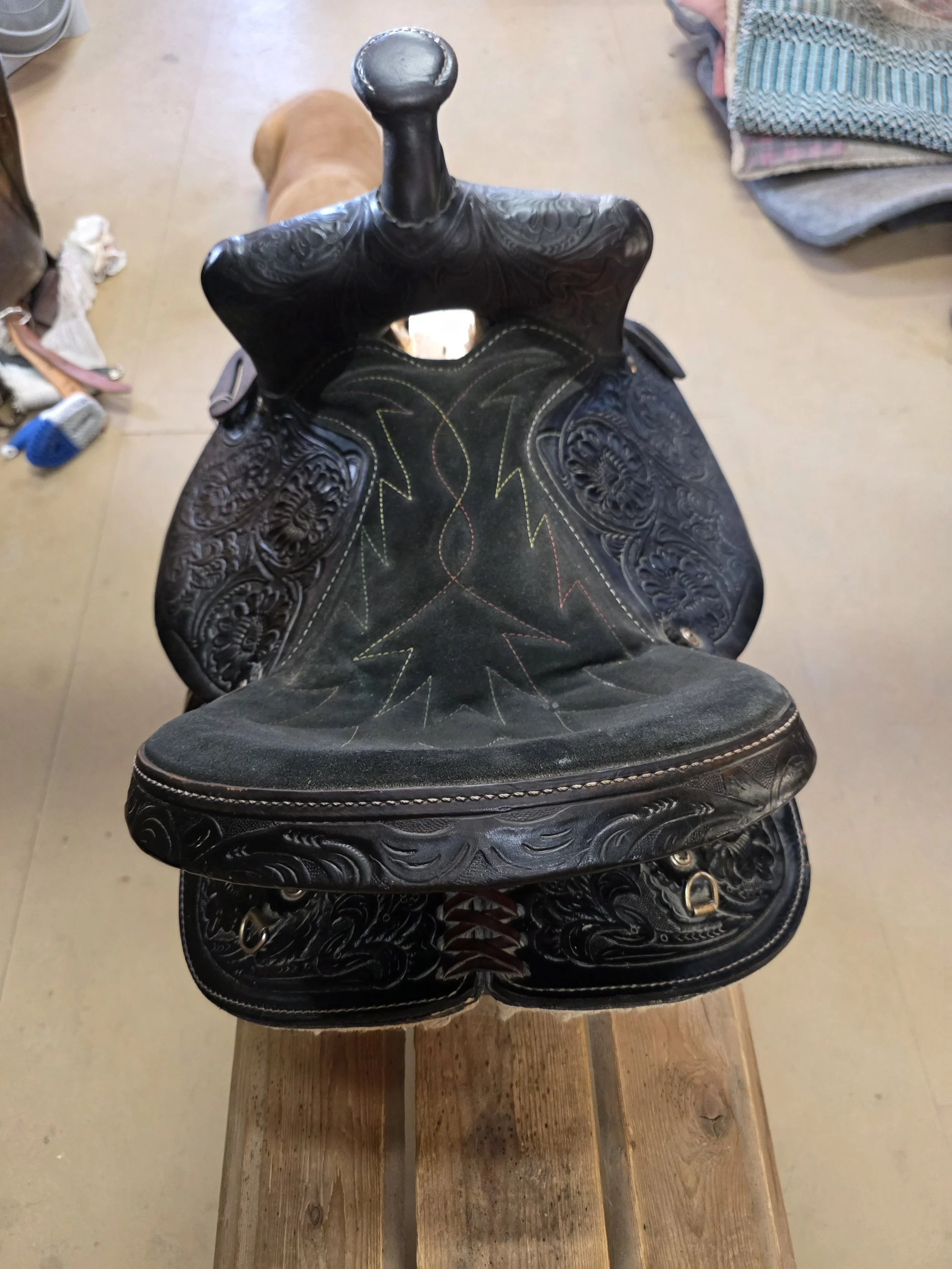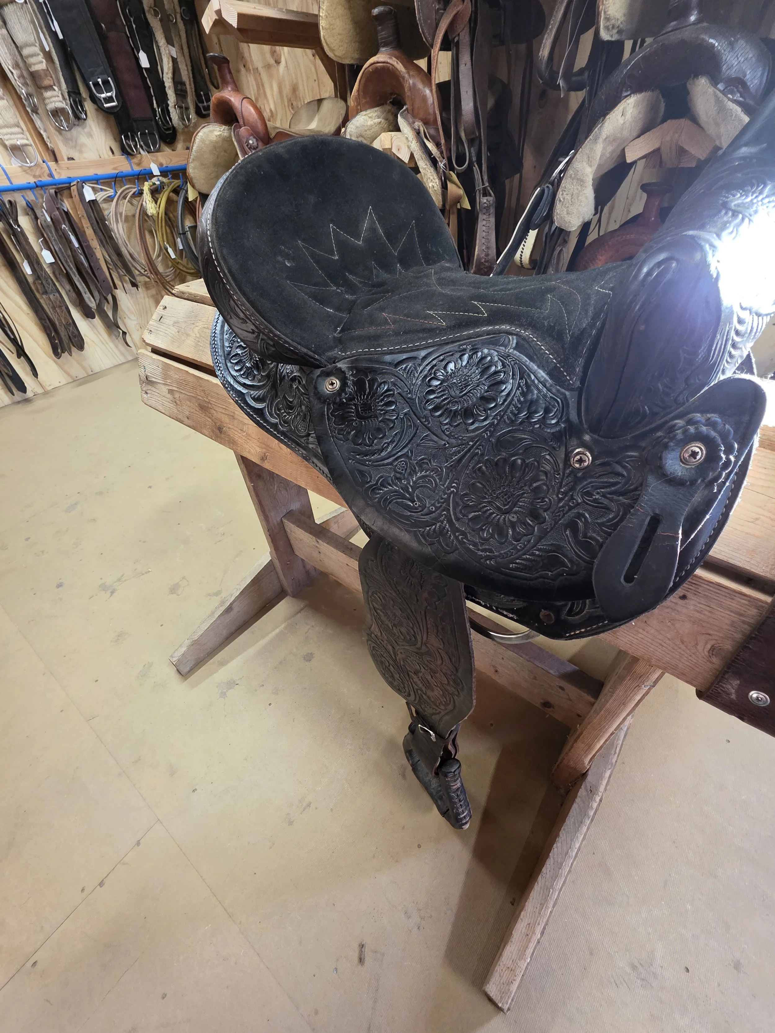 15" Saddles › S48 Image 1 of 3 Image 2 of 3 Image 3 of 3 S48 $150.00 Small Skirted 15” Saddle with a 7.5” gullet. Solid tree, horn and full lining.This saddle is ready to go! Add To Cart Added! Small Skirted 15” Saddle with a 7.5” gullet. Solid tree, horn and full lining.This saddle is ready to go!