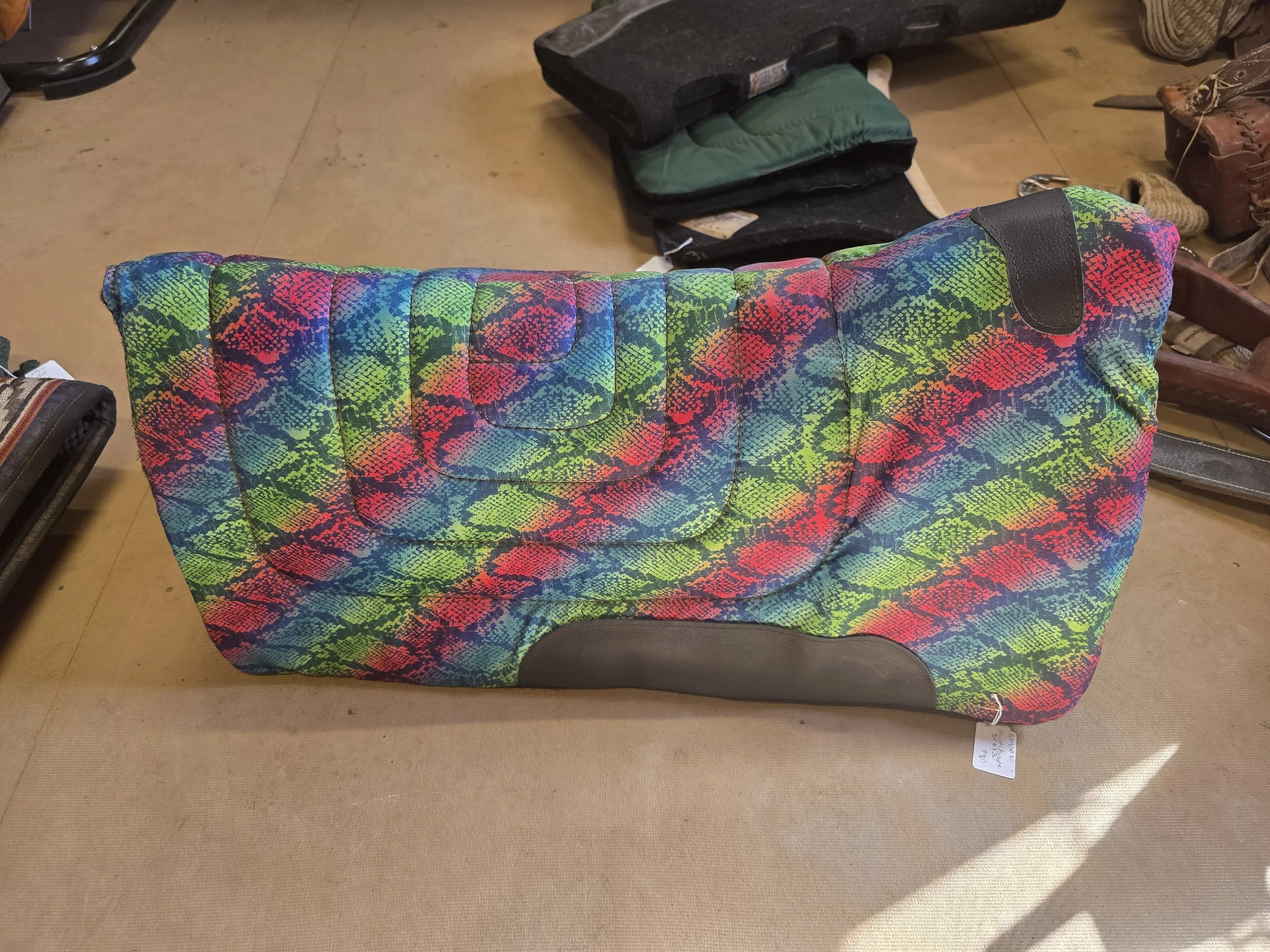 Saddle Pads › SP9 Image 1 of 2 Image 2 of 2 SP9 $80.00 Multi-colored and Snake Patterned Saddle Pad31.5”x30” Add To Cart Added! Multi-colored and Snake Patterned Saddle Pad31.5”x30”